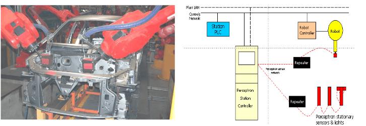 Perceptron测量系统通过机器人上的激光传感器采集车身实际尺寸,九游会J9·(china)官方网站-真人游戏第一品牌系统通过中转器把数据传输到数据控制站进行分析和标准数据进行对照比较,尺寸出现超出工艺范围,数据站立即发给PLC控制的生产线故障和报警信号,停止生产线,防止不合格车身流到下道工序。